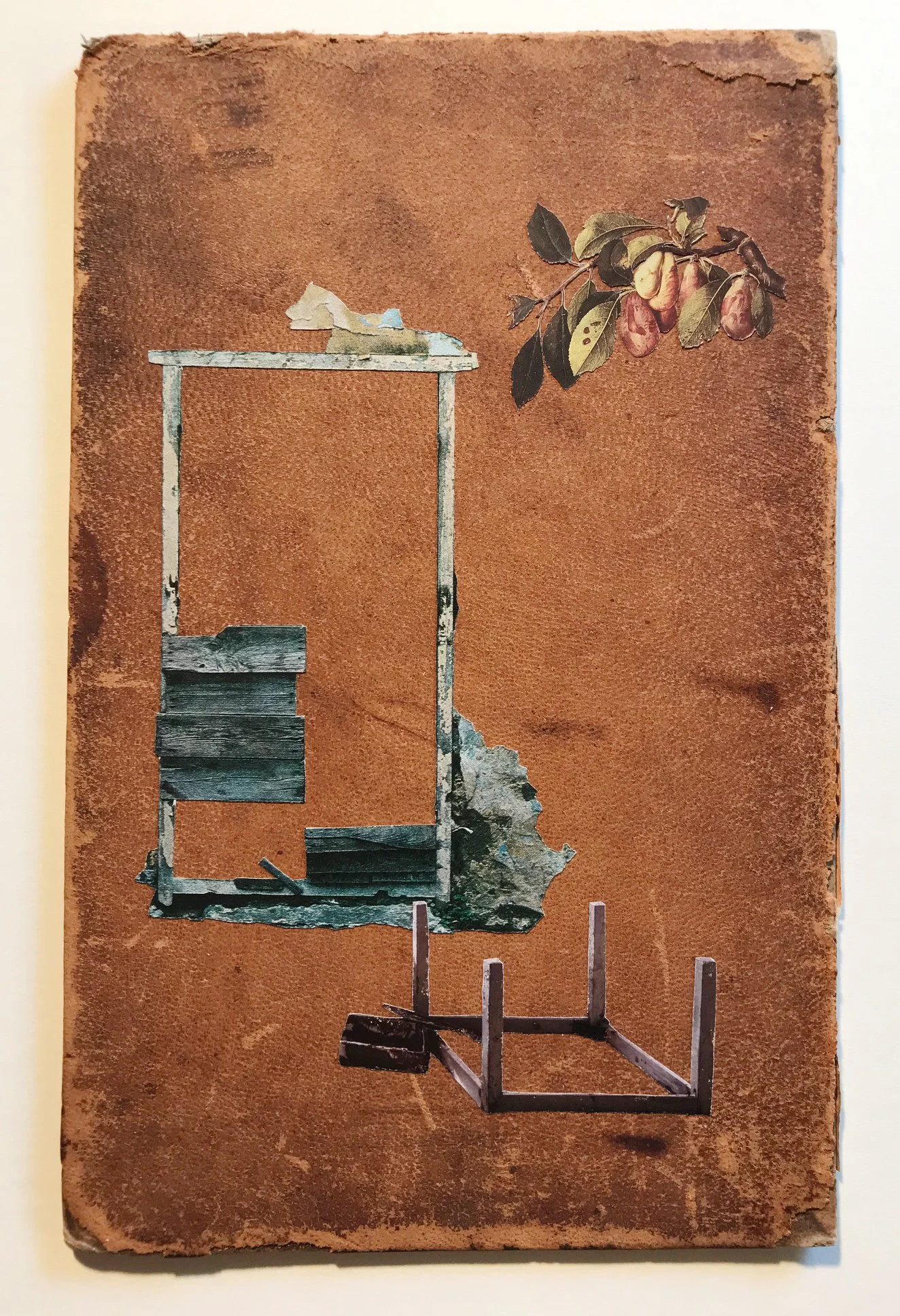 Hand cut paper collage on antique book cover interior, 8” x 5.25”